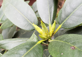 Today's view is a few snapshots I made this afternoon of our rhododendron. I haven't been paying close attention to it and just saw that it has flowers that are almost ready to bloom. Some of the leaves look a little rough but will soon be full and healthy.